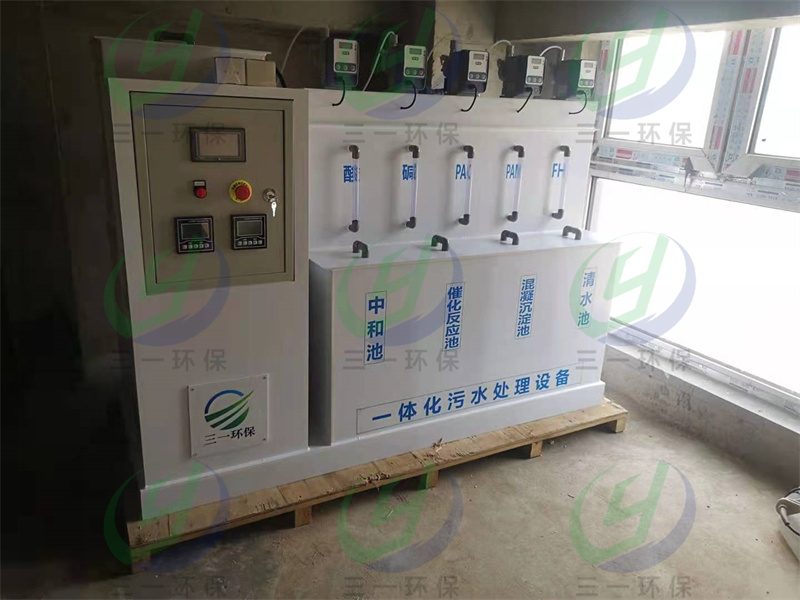实验室污水收集至集水池,集水池中的废水经过提升泵定量提升至小型实验室污水处理设备,pH调节池内设在线pH检测仪表,根据仪表信号自动加酸加碱,将pH调节至中性,之后废水通过微电解槽,利用铁碳电极之间形成无数个细微原电池,将铁氧化产生亚铁混凝剂,对于金属离子以及其他带微弱负电荷的微粒具有去除作用。之后通过斜管沉淀池,配合PAC、PAM,将废水中的金属离子生成沉淀且絮凝聚沉,在斜管沉淀池内完成泥水分离,最后通过过滤泵依次经过过滤系统及消毒系统,完成最后的深度处理,达标排放。