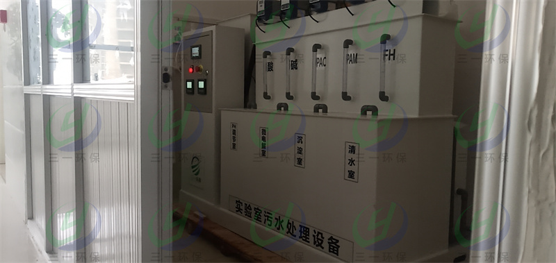 实验室污水收集至集水池,集水池中的废水经过提升泵定量提升至小型实验室污水处理设备,pH调节池内设在线pH检测仪表,根据仪表信号自动加酸加碱,将pH调节至中性,之后废水通过微电解槽,利用铁碳电极之间形成无数个细微原电池,将铁氧化产生亚铁混凝剂,对于金属离子以及其他带微弱负电荷的微粒具有去除作用。之后通过斜管沉淀池,配合PAC、PAM,将废水中的金属离子生成沉淀且絮凝聚沉,在斜管沉淀池内完成泥水分离,最后通过过滤泵依次经过过滤系统及消毒系统,完成最后的深度处理,达标排放。