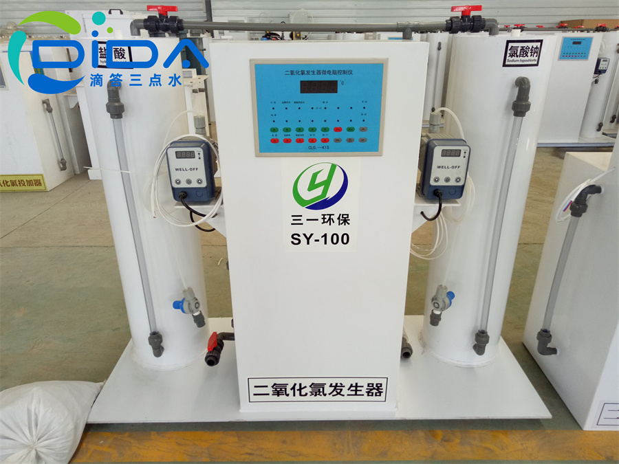 二氧化氯发生器采用化学法负压曝气工艺,以二氧化氯专用料和盐酸为原料制备二氧化氯和氯气的混合消毒液,可广泛应用于电厂、化工等循环冷却水领域,自来水领域,市政给排水领域,医院杀菌消毒领域,油田回注水领域,纺织印染领域的杀菌、消毒、灭藻、脱色、除臭,以及具有去除还原性污染成分等功效。