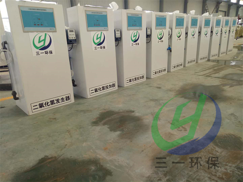 工作原理:采用电磁隔膜计量泵将配比好的二氧化氯溶液投加到所需消毒的水体中,该设备运行安全、占据空间小、安装方便、操作简单、运行费用低等诸多优点,因此在水消毒领域中得到广泛的应用。